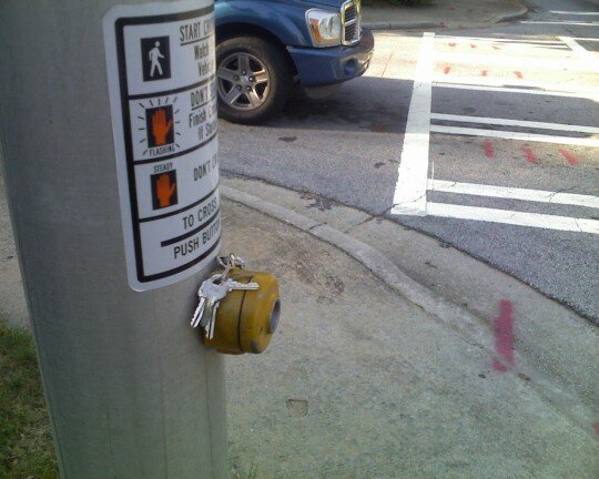You mean those keys weren’t posed? I assumed that the photographer involved set his/her keys down while getting their camera out and then decided they’d be a good element of the photo. Someone actually left their keys on the walk button? I didn’t think there was anyone in Decatur who would do anything as spacey as that besides me!