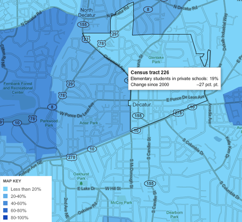 The northwest corner of the city saw a 9% increase in private school enrollment from 2000, while all the other areas of the city registered declines. This can presumably be partially attributed with dissatisfaction with the closing of the neighborhood’s school in 2003. Conversely, private school enrollment in Oakhurst dropped from 2% in 2000 to 0% in the current survey, while Winnona Park dropped 7 points to just 6% today.