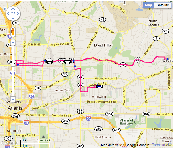 Decatur Metro | October 31, 2011 | 11:35 amEver since we discovered the CLIFF shuttles real-time bus locations website that shows you little icons scurrying along a map of the Decatur/Emory/Atlanta region, we wished that MARTA had something similar. If we had a better idea of the location of buses, perhaps some of us might be more inclined to hop “the 2” into Atlanta every once in a while.