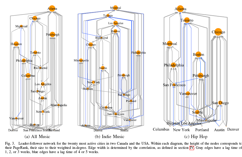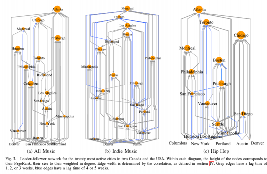 Re geographic flow of music schematics: When it comes to social network analysis, I prefer the text version. When a graphic goes beyond 3 dimensions of variables, I lose it.
