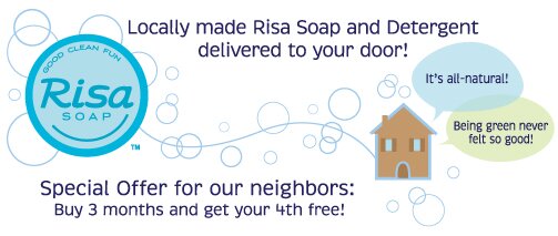 Hi Decatur neighbors – Check out the latest offer from Risa Soap, a locally owned business that makes and sells all natural soap and detergent. Risa is piloting a home delivery model for us here in Decatur and surrounding environs, a throwback to the old days of Charles Chips and Mathis milk. There are two package options for you to choose from, either ‘The Green Family’ or ‘The Natural’ package – both contain all-natural, handmade detergent and soaps, delivered to your door. You can also find out more about us at risasoap.com or on facebook. Don’t forget to use coupon code 4thfree at checkout to get your fourth month free when you order three! If you have questions, contact us at [email protected] or .