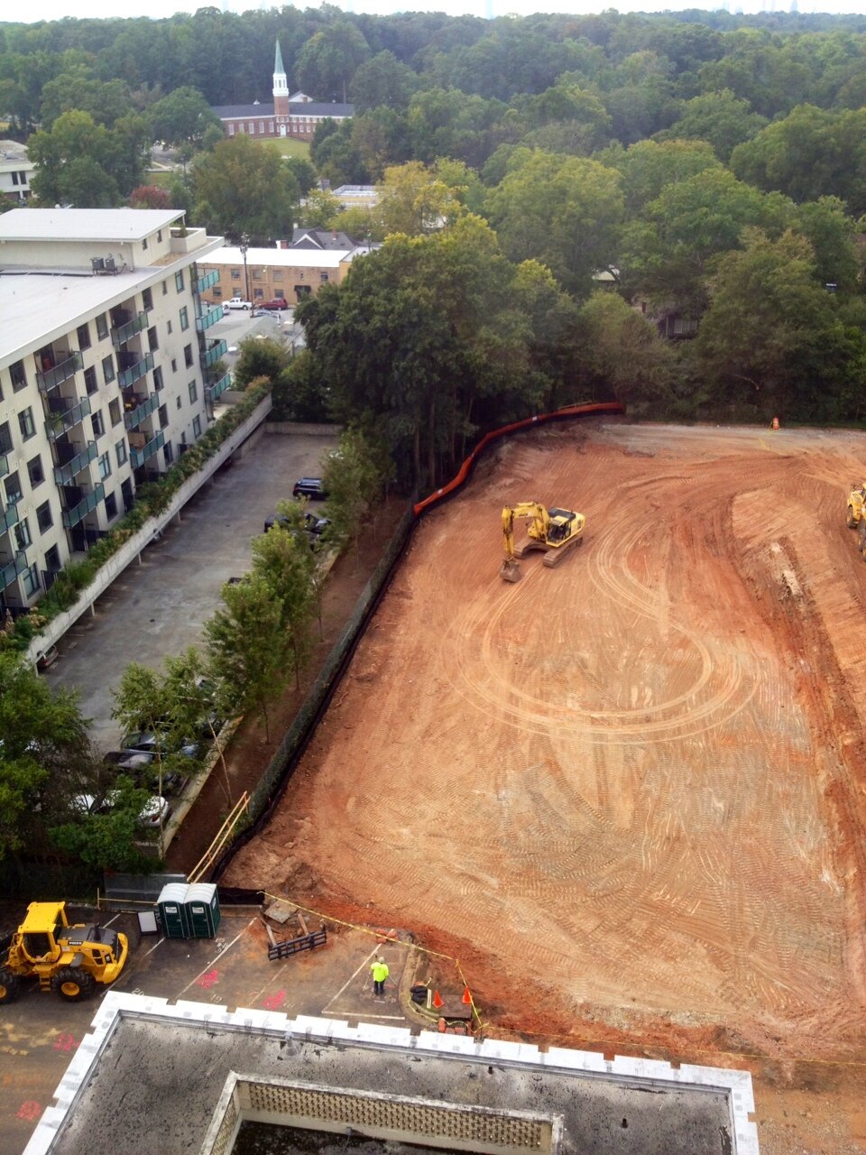 I have a lovely shot from my backyard of the 2 – 3-story mountain of dirt they built right behind our fence as they excavated for the parking deck. I came home last week and it looked like there were bulldozers in the sky. Glad to see it’s being evened back out. With the rain last night, we were kind of fearing a mudslide.