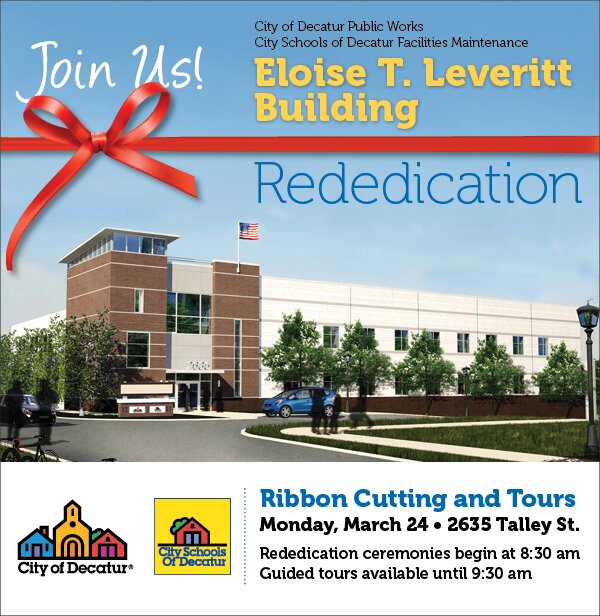 Please join City of Decatur Public Works and City Schools of Decatur Facilities Maintenance on Monday, March 24 at 8:30 a.m.for the ribbon cutting ceremony of the recently renovated Eloise T. Leveritt Building