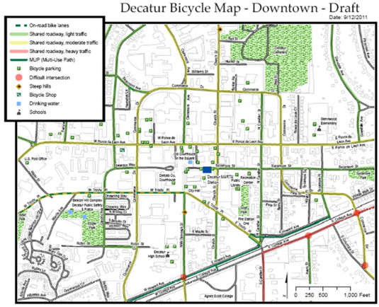 The Decatur Active Living department and the Bike Decatur advocacy group have finalized the new bike map for Decatur, which color-codes the city’s streets based on their respective conditions for cycling. Green = “best conditions for cycling”, yellow = “medium conditions for cycling” and red = “most difficult conditions”. Also included are other items cyclists might be interested in like drinking fountains, bike lanes, challenging intersections, bike shops and bike parking.