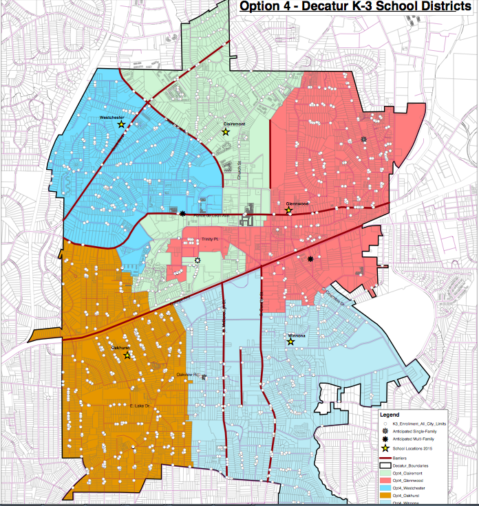 The City Schools of Decatur have now posted digital lot-by-lot maps of the K-3 rezoning options under consideration and have included a fourth option, which you can view above.