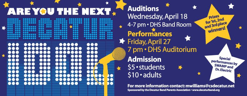 2. Decatur Idol will be held Friday April 27th at 7 PM in the DHS Auditorium. Kids will be competing for the coveted title, as well as prizes for 1st, 2nd and 3rd place. Admission is $5 for students and $10 for adults. There will also be a special performance by two local favorites: SWAMP and Dr. Electric.